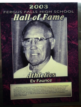Ev Faunce, a 1944 graduate of Fergus Falls High Schoo, was a xxx athlete in football, basketball and track during his xxx. He was an all-state football player in 1943 xxx MVP in both football and basketball. Faunce went on to play at Iowa State, then for legendary coach Bernie Bierman at the University of Minnesota. During his senior year in 1948, he was chosen as the Gopher MVP. His football career included time with the Baltimore Colts and as head coach at Utah State University. In 1998, he was chosen as the Fergus Falls Chamber of Commerce’s Athlete of the Century. (xxx means information provided is unreadable. Will fill in blanks at a future date.)