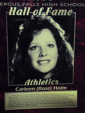 Carleen (Rose) Holm was a standout athlete at Fergus Falls High School, where she was a five-year letter winner in tennis and a four-year letter winner in both basketball and track. She made state tournament appearances in tennis and track. When she graduated in 1989, Holm held numerous school records in track and in basketball, where she is among the all-time leaders in rebounding, assists, scoring and steals. Holm went on to become a three-year basketball starter at South Dakota State University, where she had a full athletic scholarship, and is among the school’s leaders in career points, rebounds and assists. She earned her bachelor’s and master’s degrees at SDSU and pursued a career as a school counselor.