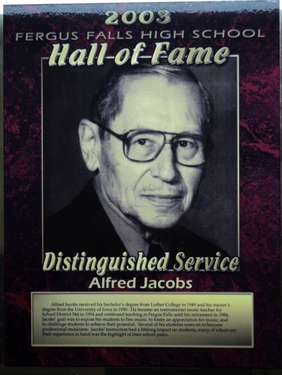 Alfred Jacobs received his bachelor’s degree from Luther College in 1949 and his master’s degree from the University of Iowa in 1950. He became an instrumental music teacher for School District 544 in 1954 and continued teaching in Fergus Falls until his retirement in 1984. Jacobs’ goal was to expose his students to fine music, to foster an appreciation for music, and to challenge students to achieve their potential. Several of his students went on to become professional musicians. Jacobs’ instruction had a lifelong impact on students, many of whom say their experience in band was the highlight of their school years.