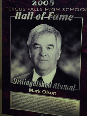 Following his graduation from Fergus Falls High School in 1961, Mark Olson earned a degree in economics from St. Olaf College and worked in banking and politics. He returned to Fergus Falls from 1976-88 to serve as president and CEO of Security State Bank, which his father had helped charter in 1957. He was also president of Rotary and on the boards of the YMCA, Concert Association, Chamber of Commerce, Pioneer Home and Lake Region Hospital. In 1986, at the age of 43, Olson became the youngest person elected president of the American Bankers Association. Olson became a partner in the accounting firm of Ernst & Young LLP in 1988, and he later served as staff director of the Security Subcommittee of the Banking Committee in the U.S. Senate. In 2001 he was appointed to fill an unexpired term as a member of the Board of Governors of the Federal Reserve System. Olson was named a Distinguished Alumni of St. Olaf College in 2003.