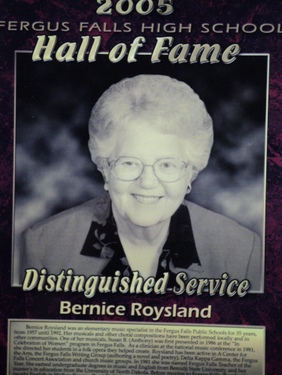 Bernice Roysland was an elementary music specialist in the Fergus Falls Public Schools for 35 years, from 1957 until 1992. Her musicals and other choral compositions have been performed locally and in other communities. One of her musicals, Susan B. (Anthony) was first presented in 1986 at the “In Celebration of Women” program in Fergus Falls. As a clinician at the national music conference in 1981, she directed her students in a folk opera they helped create. Roysland has been active in A Center for the Arts, the Fergus Falls Writing Group (authoring a novel and poetry), Delta Kappa Gamma, the Fergus Falls Concert Association and church music groups. In 1981 she was named Fergus Falls Teacher of the Year. She earned undergraduate degrees in music and English from Bemidji State University and her master’s in education from the University of North Dakota. Before moving to Fergus Falls, Roysland taught English in Walker, Benson, Bemidji, Duluth and Lewiston, Mont.