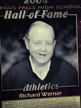 Dick Werner, Class of 1962, earned 15 letters – a school record – while participating in football, wrestling, hockey, track and baseball at Fergus Falls High School. As a senior, he was a 1961 WCCO Radio all-state selection in football, won the 1962 District 23 heavyweight wrestling title, and served as captain of the hockey team. As a junior, he was a member of the 1961 Otter state tournament baseball team and won conference and district discus titles in track. Werner went on to star in football at Bemidji State University and lettered in hockey, baseball and track, where he set a school record in discus. After college, he had a tryout with famed Green Bay Packers coach Vince Lombardi. His Fergus Falls business, Rischard Marketing (known as Tag-Up) designs and manufactures items used by professional baseball, football, basketball and hockey teams, as well as by high schools and colleges across the country. In 1986, Werner was inducted into the BSU Athletic Hall of Fame.