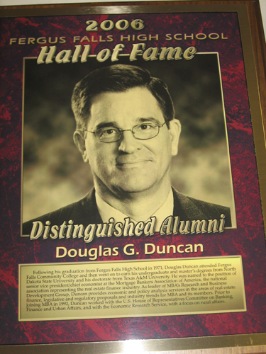 Following his graduation from Fergus Falls High School in 1971, Douglas Duncan attended Fergus Falls Community College and then went on to earn his undergraduate and master’s degrees from North Dakota State University and his doctorate from Texas A&M University. He was named to the position of senior vice president/chief economist at the Mortgage Bankers Association of America, the national association representing the real estate finance industry. As leader of MBA’s Research and Business Development Group, Duncan provides economic and policy analysis services in the areas of real estate finance, legislative and regulatory proposals and industry trends for MBA and its members. Prior to joining MBA in 1992, Duncan worked with the U.S. House of Representatives Committee on Banking, Finance, and Urban Affairs, and with the Economic Research Service, with a focus on rural affairs.