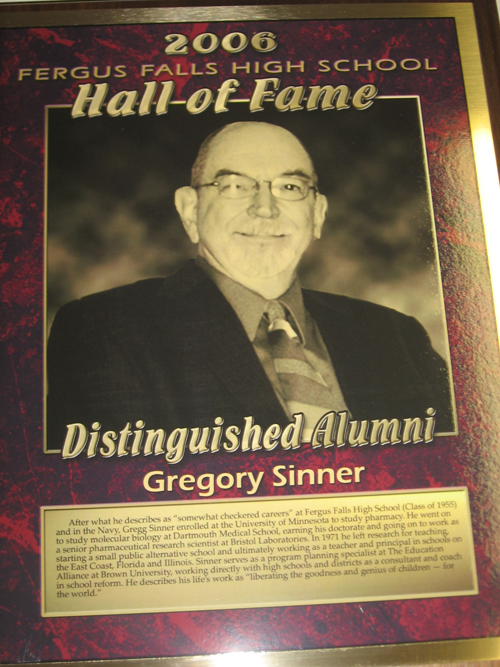 After what he describes as “somewhat checkered careers” at Fergus Falls High School (Class of 1955) and in the Navy, Gregg Sinner enrolled at the University of Minnesota to study pharmacy. He went on to study molecular biology at Dartmouth Medical School, earning his doctorate and going on to work as a senior pharmaceutical research scientist at Bristol Laboratories. In 1971 he left research for teaching, starting a small public alternative school and ultimately working as a teacher and principal in schools on the East Coast, Florida, and Illinois. Sinner serves as a program planning specialist at The Education Alliance at Brown University, working directly with high schools and districts as a consultant and in school reform. He describes his life’s work as “liberating the goodness and genius of children – for the world.”