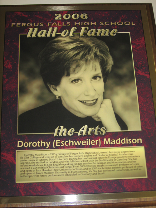 Dorothy Maddison, a 1973 graduate of Fergus Falls High School, earned her music degree from St. Olaf College and went on to complete her master’s degree and Doctor of Musical Arts in vocal performance at Arizona State University. During her professional career in Europe as a lyric-coloratura soprano, she studied in London, and was full-time soloist with the Stad theater in Germany. She has co-authored a book a book to help English speaking singers survive the German audition process and has released a CD entitled Christmas Art Songs. From 2000-2002 she taught as assistant professor of voice and opera at Sam Houston State University in Texas, and in 2002 she became assistant professor of voice and opera at James Madison University in Harrisonburg, Va. She has performed nationwide, as well as in Europe, with future performances scheduled in Germany and Brazil.
