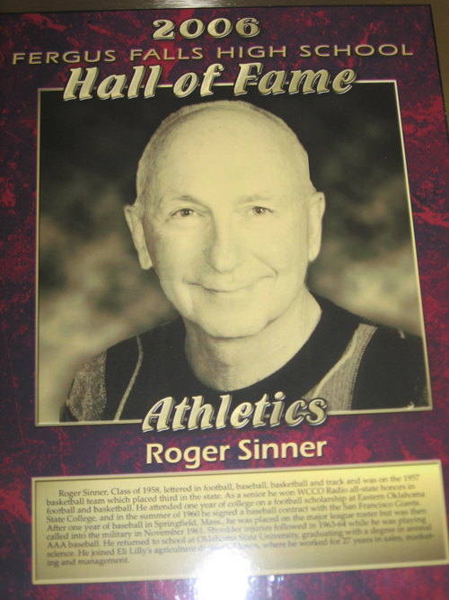 Roger Sinner, Class of 1958, lettered in football, baseball, basketball, and track and was on the 1957 basketball team which placed third in the state. As a senior he won WCCO Radio all-state honors in football and basketball. He attended one year of college on a football scholarship at Eastern Oklahoma State College, and in the summer of 1960 he signed a baseball contract with the San Francisco Giants. After one year of baseball in Springfield, Mass., he was placed on the major league roster but was then called into the military in November 1961. Shoulder injuries followed in 1963-64 while he was playing AAA baseball. He returned to school at Oklahoma State University, graduating with a degree in animal science. He joined Eli Lilly’s agriculture division, where he worked for 27 in sales, marketing, and management.