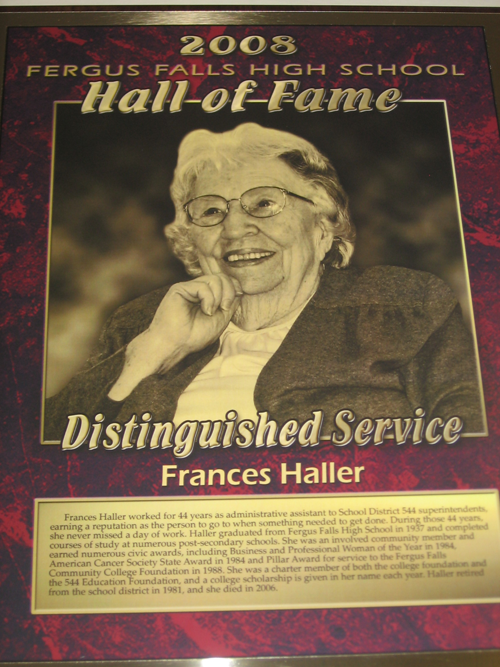 Frances Haller worked for 44 years as administrative assistant to School District 544 superintendents, earning a reputation as the person to go to when something needed to get done. During those 44 years, she never missed a day of work. Haller graduated from Fergus Falls High School in 1937 and completed courses of study at numerous post-secondary schools. She was an involved community member and earned numerous civic awards, including Business and Professional Woman of the Year in 1984, American Cancer Society State Award in 1984, and Pillar Award for service to the Fergus Falls Community College Foundation in 1988. She was a charter member of both the college foundation and the 544 Education Foundation, and a college scholarship is given in her name each year. Haller retired from the school district in 1981 and she died in 2006.