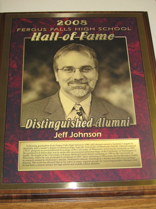Following graduation from Fergus Falls High School in 1980, Jeff Johnson earned a bachelor’s degree in chemistry and a master’s degree in pharmacology from the University of Minnesota-Duluth. Johnson entered a Ph.D. program in environmental toxicology at the University of Wisconsin, receiving his doctorate in 1992. His postdoctoral fellowship was in molecular neuroscience/pharmacology at the University of Washington in Seattle. He taught at the University of Kansas Medical Center before returning in 1999 to the University of Wisconsin, where he was promoted to professor in 2007. Since returning to Wisconsin, he has become a leader in research related to Alzheimer’s disease, Parkinson’s disease, Huntington’s disease and ALS (Lou Gehrig’s disease). His work has allowed him to be active in many support groups for neurodegenerative diseases and he has been a science mentor for high school and middle school students.