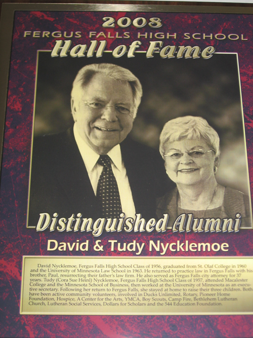 David Nycklemoe, Fergus Falls High School Class of 1956, graduated from St. Olaf College in 1960 and the University of Minnesota Law School in 1963. He returned to practice law in Fergus Falls with his brother, Paul, resurrecting their father’s law firm. He also served as Fergus Falls city attorney for 37 years. Tudy (Cora Sue Heinl) Nycklemoe, Fergus Falls High School Class of 1957, attended Macalester College and the Minnesota School of Business, then worked at the University of Minnesota as an executive secretary. Following her return to Fergus Falls, she stayed at home to raise their three children. Both have been active community volunteers, involved in Ducks Unlimited, Rotary, Pioneer Home Foundation, Hospice, A Center for the Arts, YMCA, Boy Scouts, Camp Fire, Bethlehem Lutheran Church, Lutheran Social Services, Dollars for Scholars, and the 544 Education Foundation.