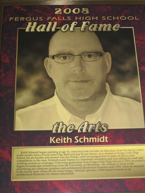 Keith Schmidt began painting at age 10, when he’d ride his bike on Saturdays from his family’s farm to the nearby farm of local artist Olga Kjell and pay $1 per lesson. As a student at Fergus Falls High School, his art teacher and mentor was Joe Formic, who encouraged him to enter art shows and competitions in the area. Schmidt made frames in a basement woodshop and was selling his work and winning awards as a teenager. Following graduation from Fergus Falls High School in 1974, he earned a degree in landscape architecture from the University of Minnesota. He worked in Texas in the advertising art, computer graphics, and architectural illustration business until 1999, when he returned to the family farm where his art career began. Schmidt operates a Web-based business as an architectural illustrator for clients nationwide.