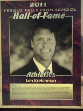 Len Kretchman was a three-sport athlete for the Class of 1984, competing in football, basketball, and track for Hall of Fame coaches Don Stueve, Bob Bjorklund, and Terry Harrington. Kretchman led the Otters in rushing during his junior and senior years, when the Otters were 16-3 and competed in the state tournament in 1982. As a senior, he was a member of the first Otter basketball team to qualify for state in more than 30 years. He qualified for the state track meet as a junior, and he still holds school records in the 300 IMH and 4×100 meter relay. At North Dakota State University he started every game in his four-year football career, and the Bison were national champions in three of those seasons.