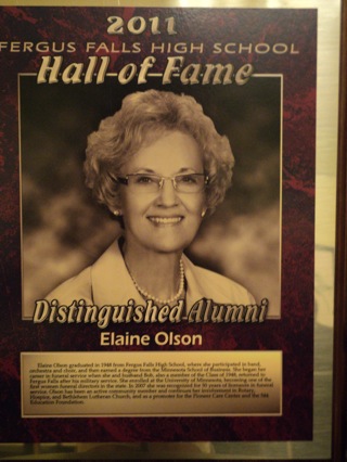 Elaine Olson graduated in 1948 from Fergus Falls High School, where she participated in band, orchestra and choir, and then earned a degree from the Minnesota School of Business. She began her career in funeral service when she and husband Bob, also a member of the Class of 1948, returned to Fergus Falls after his military service. She enrolled at the University of Minnesota, becoming one of the first women funeral directors in the state. In 2007 she was recognized for 50 years of licensure in funeral service. Olson has been an active community member and continues her involvement in Rotary, Hospice, and Bethlehem Lutheran Church, and as a promoter for the Pioneer Care Center and the 544 Education Foundation.