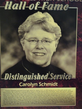 Carolyn Schmidt graduated from high school in Lakota, ND in 1965 during an era when girls sports were non-existent. She earned her undergraduate degree at North Dakota State University, where she played volleyball and basketball, then began her 40-year teaching career when she was hired to teach physical education at Fergus Falls Junior High School in 1969. Girls sports were just beginning at the high-school level, and Schmidt coached varsity gymnastics from 1971-1987, started and coached varsity volleyball from 1978-1983, and started and coached varsity softball from 1992-2000. She also played softball with local teams for many years. Schmidt did graduate work at West Chester State College in Pennsylvania and received her master’s degree from the University of St. Thomas. She retired from teaching in 2009. During her teaching career she was named 1984 Teacher of the Year and Coach of the Year in 1994. She was inducted into the Fergus Falls Sports Hall of Fame in 1990 and the NDSU Sports Hall of Fame in 1993, and in 2006 she was honored with Minnesota’s Breaking Barriers Award.