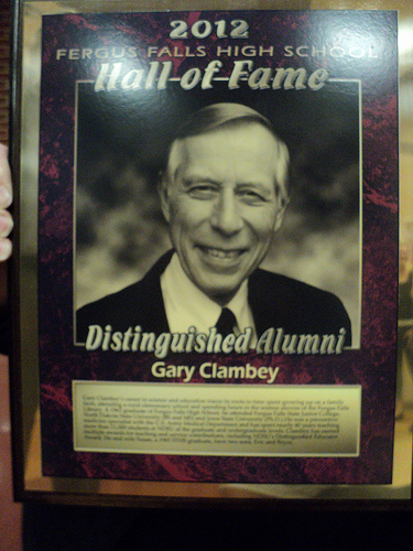 Gary Clambey’s career in science and education traces its roots to time spent growing up on a family farm, attending a rural elementary school and spending hours in the science alcoves of the Fergus Falls Library. A 1963 graduate of Fergus Falls High School, he attended Fergus Falls State Junior College, North Dakota State University (BS and MS) and Iowa State University (Ph.D.) He was a preventive medicine specialist with the U.S. Army Medical Department and has spent nearly 40 years teaching more than 11,000 students at NDSU at the graduate and undergraduate levels. Clambey has earned multiple awards for teaching and service contributions, including NDSU’s Distinguished Educator Award. He and wife Susan, a 1965 FFHS graduate, have two sons, Eric and Bryce.