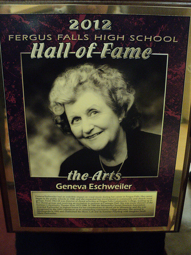 Geneva Eschweiler had an indelible impact on vocal music during her career in Fergus Falls. Her career began in the public schools in 1948, and she expanded her involvement to community and church vocal groups. From 1962-68 was director of choral activities at Fergus Falls Community College, leading up to five choral groups and receiving an invitation to perform at Carnegie Hall. She was music director of the Summer Community Theater from 1972-1988. In 1990 the Minnesota Choral Directors Association awarded Eschweiler its highest honor for her contributions to choral art in Minnesota, and she was recognized by the 1993 Legislature as an outstanding community college educator. She moved to Minneapolis in 1993 and established the Music Loft and its Summer Playshop with daughter Sarah Marie Eschweiler.