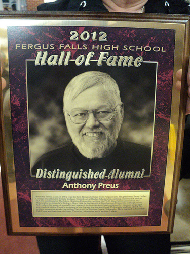 Anthony Preus, Class of 1954, was the first Rhodes Scholar from Fergus Falls. He graduated from Luther College and attended Trinity College, Oxford, on a Rhodes Scholarship, earning a second BA and an MA. He continued at The Johns Hopkins University, writing his Ph.D. dissertation on Science and Philosophy in Aristotle’s Biology. Since 1964 he has taught at Binghamton University in Binghamton, N.Y., where his areas of specialty and research include ancient Greek philosophy, classical languages and medical ethics. Preus is secretary of the Society for Ancient Greek Philosophy and has edited and written numerous works, including The A to Z of Ancient Greek Philosophy. He is married to Meredith Pell Preus and has three children, Christian, Alexander and Caroline (Linka).