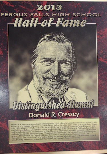 Donald R. Cressey was a penologist, sociologist and criminologist who made innovative contributions to the study of organized crime, prisons, criminology and white-collar crime. After graduating from Fergus Falls High School in 1937, he earned his bachelor’s degree in sociology from Iowa State University and his Ph.D. from Indiana University. Cressey taught sociology at the University of California Los Angeles and Santa Barbara until his retirement in 1986. He wrote extensively, including books on embezzlement and organized crime and co-authored “Principles of Criminology,” the standard text in criminology for 30 years. He served on the Organized Crime Task Force of the President’s Commission on Law Enforcement and Administration of Justice during the Johnson administration, and after his retirement from teaching he became president of the Institute for Financial Crimes Prevention.