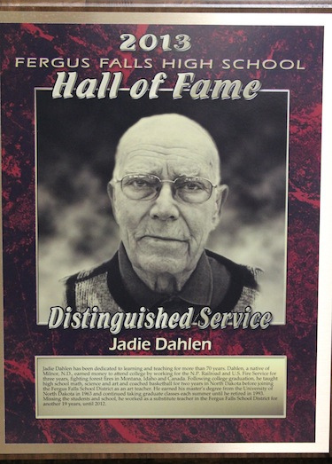 Jadie Dahlen has been dedicated to learning and teaching for more than 70 years. Dahlen, a native of Milnor, ND, earned money to attend college by working for the N.P Railroad and U.S. Fire Service for three years, fighting forest fires in Montana, Idaho and Canada. Following college graduation, he taught high school math, science and art and coached basketball for two years in North Dakota before joining the Fergus Falls School District as an art teacher. He earned his master’s degree from the University of North Dakota in 1963 and continued taking graduate classes each summer until he retired in 1993. Missing the students and school, he worked as a substitute teacher in the Fergus Falls School District for another 19 years, until 2012.