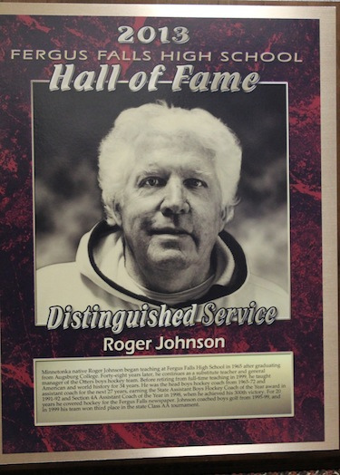 Minnetonka native Roger Johnson began teaching at Fergus Falls High School in 1965 after graduating from Augsburg College. Forty-eight years later, he continues as a substitute teacher and general manager of the Otters boys hockey team. Before retiring from full-time teaching in 1999, he taught American and world history from 34 years. He was the head boys hockey coach from 1965-1972 and assistant coach for the next 27 years, earning the State Assistant Boys Hockey Coach of the Year award in 1991-1992 and Section 4A Assistant Coach of the Year in 1998, when he achieved his 300th victory. For 20 years he covered hockey for the Fergus Falls newspaper. Johnson coached boys golf from 1995-1999, and in 1999 his team won third place in the state Class AA tournament.