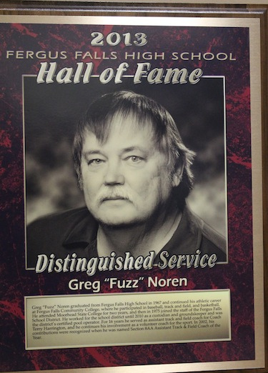 Greg “Fuzz” Noren graduated from Fergus Falls High School in 1967 and continued his athletic career at Fergus Falls Community College, where he participated in baseball, track and field, and basketball. He attended Moorhead State College for two years, and then in 1975 joined the staff of the Fergus Falls School District. He worked for the school district until 2010 as a custodian and groundskeeper and was the district’s certified pool operator. For 16 years he served as assistant track and field coach for Coach Terry Harrington, and he continues his involvement as a volunteer coach for the sport. In 2002, his contributions were recognized when he was named Section 8AA Assistant Track & Field Coach of the Year.