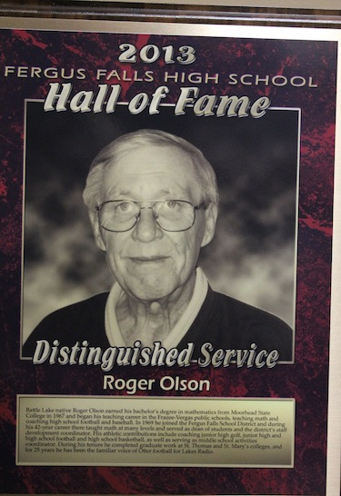 Battle Lake native Roger Olson earned his bachelor’s degree in mathematics from Moorhead State College in 1967 and began his teaching career in the Frazee-Vergas public schools, teaching math and coaching high school football and baseball. In 1969 he joined the Fergus Falls School District and during his 42-year career taught math at many levels and served as Dean of Students and the District’s staff development coordinator. His athletic contributions include coaching junior high golf, junior high and high school football and high school basketball, as well as serving as middle school activities coordinator. During his tenure he completed graduate work at St. Thomas and St. Mary’s colleges, and for 25 years he has been the familiar voice of Otter football for Lakes Radio.