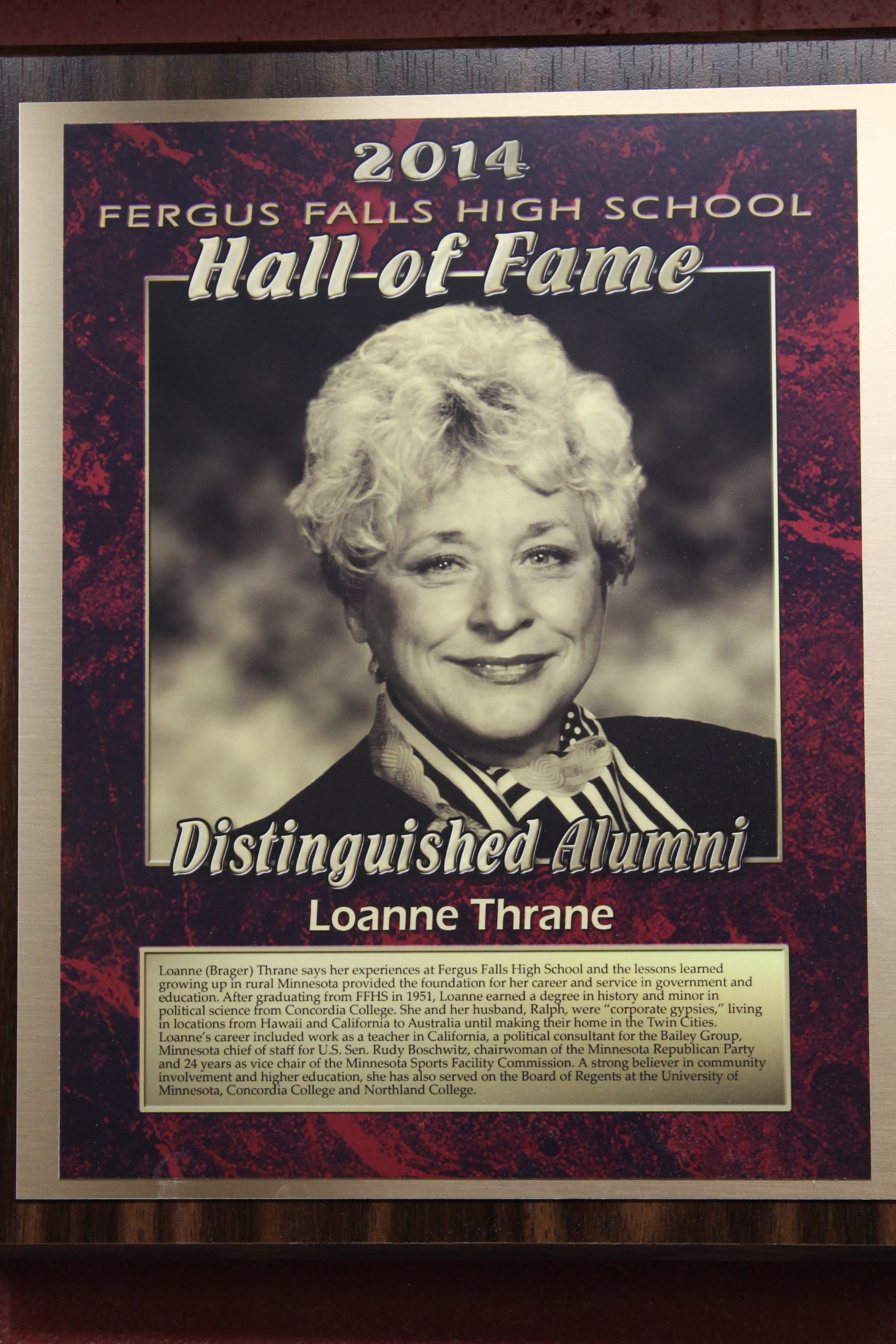 Loanne (Brager) Thrane says her experiences at Fergus Falls High School and the lessons learned growing up in rural Minnesota provided the foundation for her career and service in government and education. After graduating from FFHS in 1951, Loanne earned a degree in history and minor in political science from Concordia College. She and her husband, Ralph, were “corporate gypsies,” living in locations from Hawaii and California to Australia until making their home in the Twin Cities. Loanne’s career included work as a teacher in California, a political consultant for the Bailey Group, Minnesota chief of staff for U.S. Sen. Rudy Boschwitz, chairwoman of the Minnesota Republican Party and 24 years as vice chair of the Minnesota Sports Facility Commission. A strong believer in community involvement and higher education, she has also served on the Board of Regents at the University of Minnesota, Concordia College and Northland College.