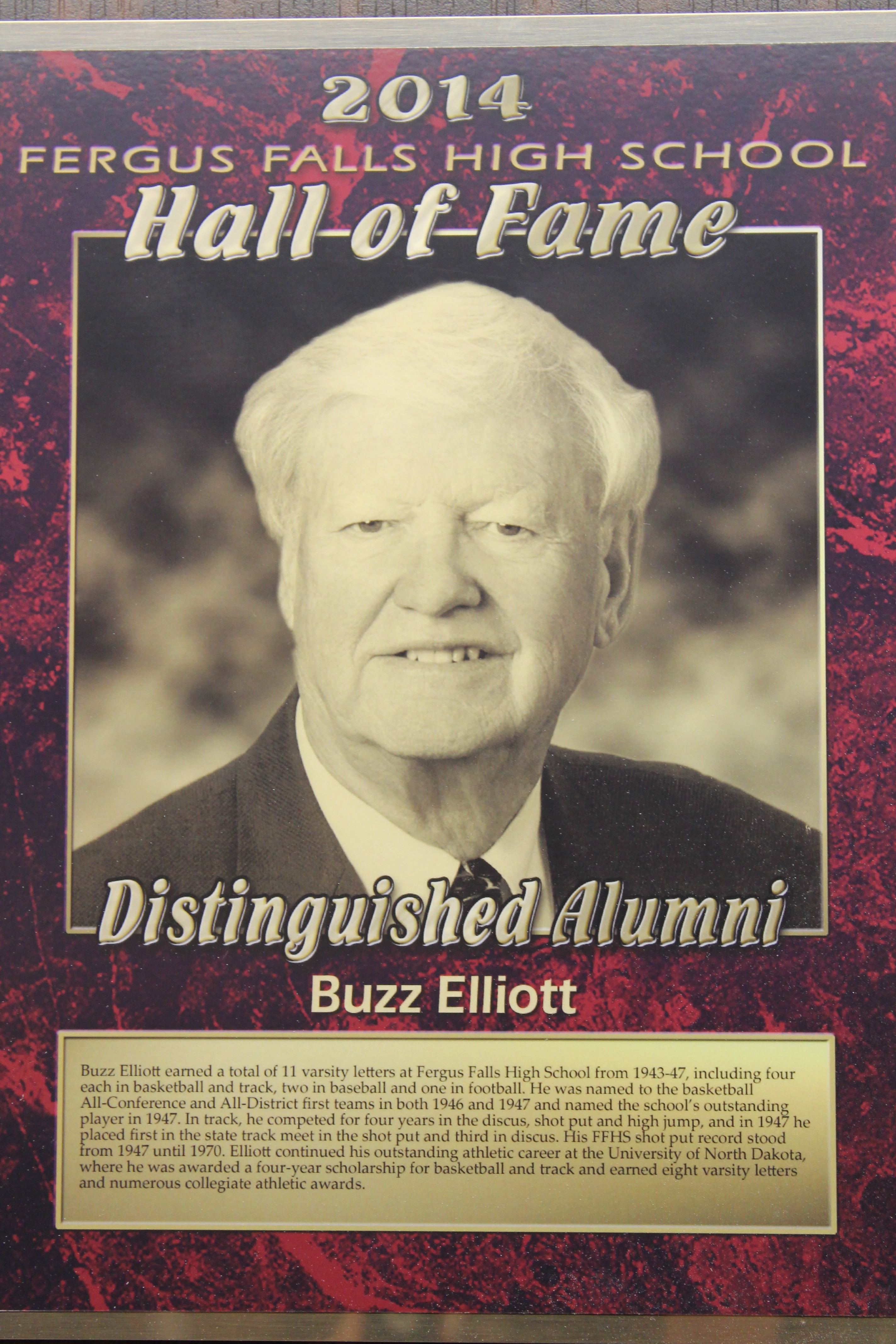 Buzz Elliott earned a total of 11 varsity letters at Fergus Falls High School from 1943-47, including four each in basketball and track, two in baseball and one in football. He was named to the basketball All-Conference and All-District first teams in both 1946 and 1947 and named the school’s outstanding player in 1947. In track, he competed for four years in the discus, shot put and high jump, and in 1947 he placed first in the state track meet in the shot put and third in discus. His FFHS shot put record stood from 1947 until 1970. Elliott continued his outstanding athletic career at the University of North Dakota, where he was awarded a four-year scholarship for basketball and track and earned eight varsity letters and numerous collegiate athletic awards.