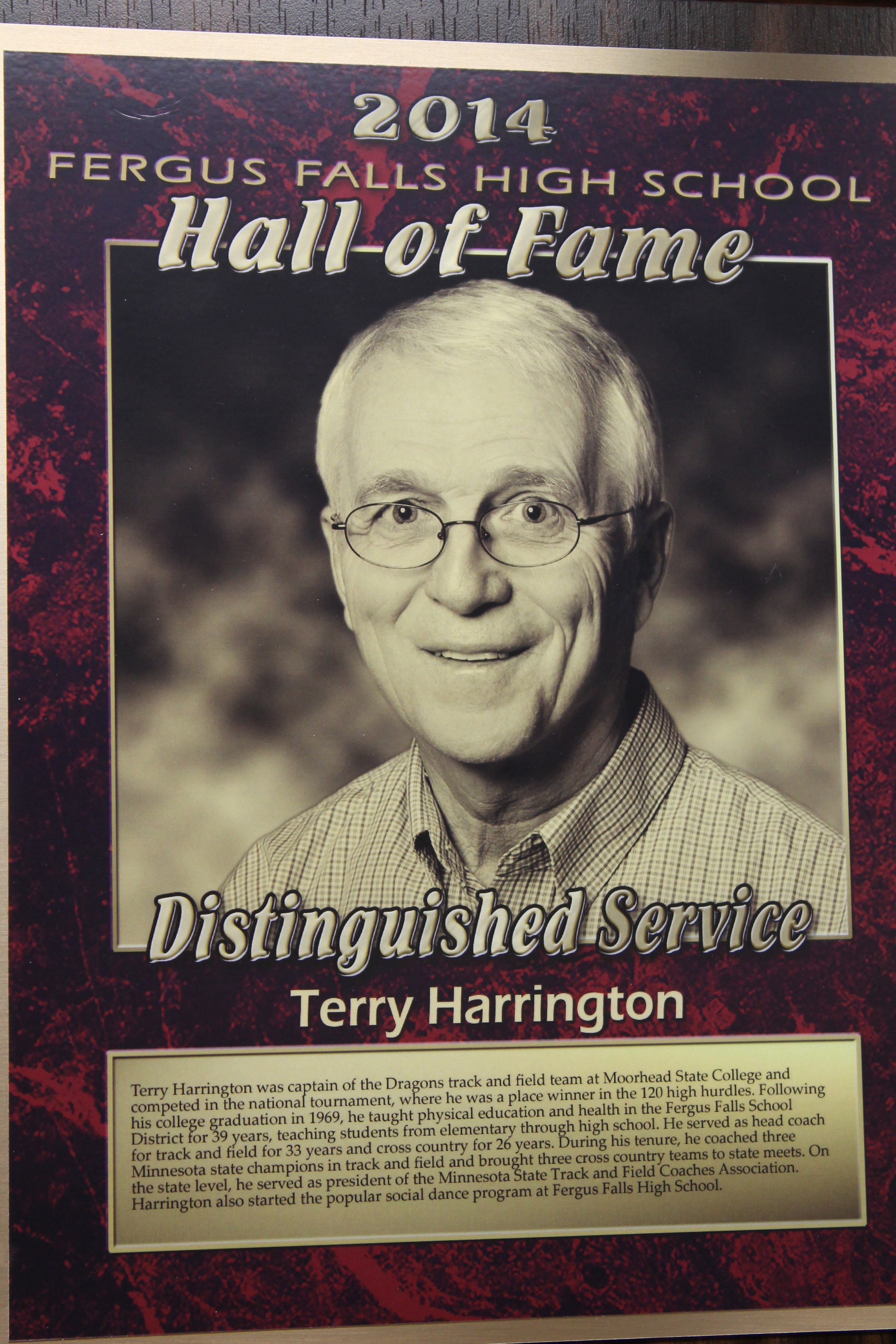 Terry Harrington was captain of the Dragons track and field team at Moorhead State College and competed in the national tournament, where he was a place winner in the 120 high hurdles. Following his college graduation in 1969, he taught physical education and health in the Fergus Falls School District for 39 years, teaching students from elementary through high school. He served as head coach for track and field for 33 years and cross country for 26 years. During his tenure, he coached three Minnesota state champions in track and field and brought three cross country teams to state meets. On the state level, he served as president of the Minnesota State Track and Field Coaches Association. Harrington also started the popular social dance program at Fergus Falls High School.